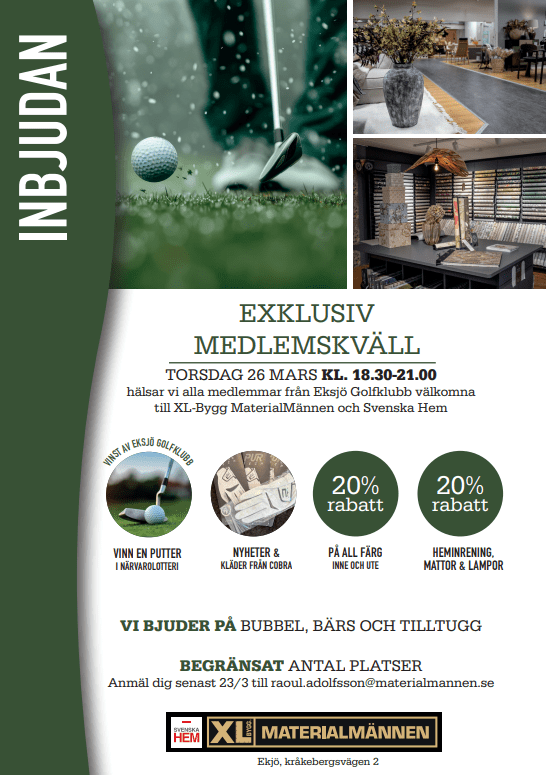 Klubbkväll på XL Bygg Materialmännen! På torsdag har vi klubbkväll på XL Bygg Materialmännen. Som medlem i Eksjö GK så är du specialinbjuden till denna kväll. Det finns möjlighet att klämman och känna på årets nyheter ifrån Cobra, Puma, Taylor Made och BigMAX! Vi lottar också ut en putter i från Cobra bland de som […]